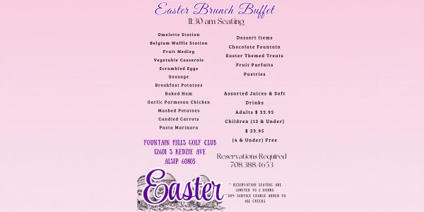 Celebrate Easter with a festive brunch buffet at Fountain Hills Golf Club! Enjoy a delicious spread including an omelette station, Belgian waffles, scrambled eggs, baked ham, garlic parmesan chicken, pasta marinara, and more. Don’t forget to indulge in dessert favorites like a chocolate fountain, pastries, and Easter-themed treats.