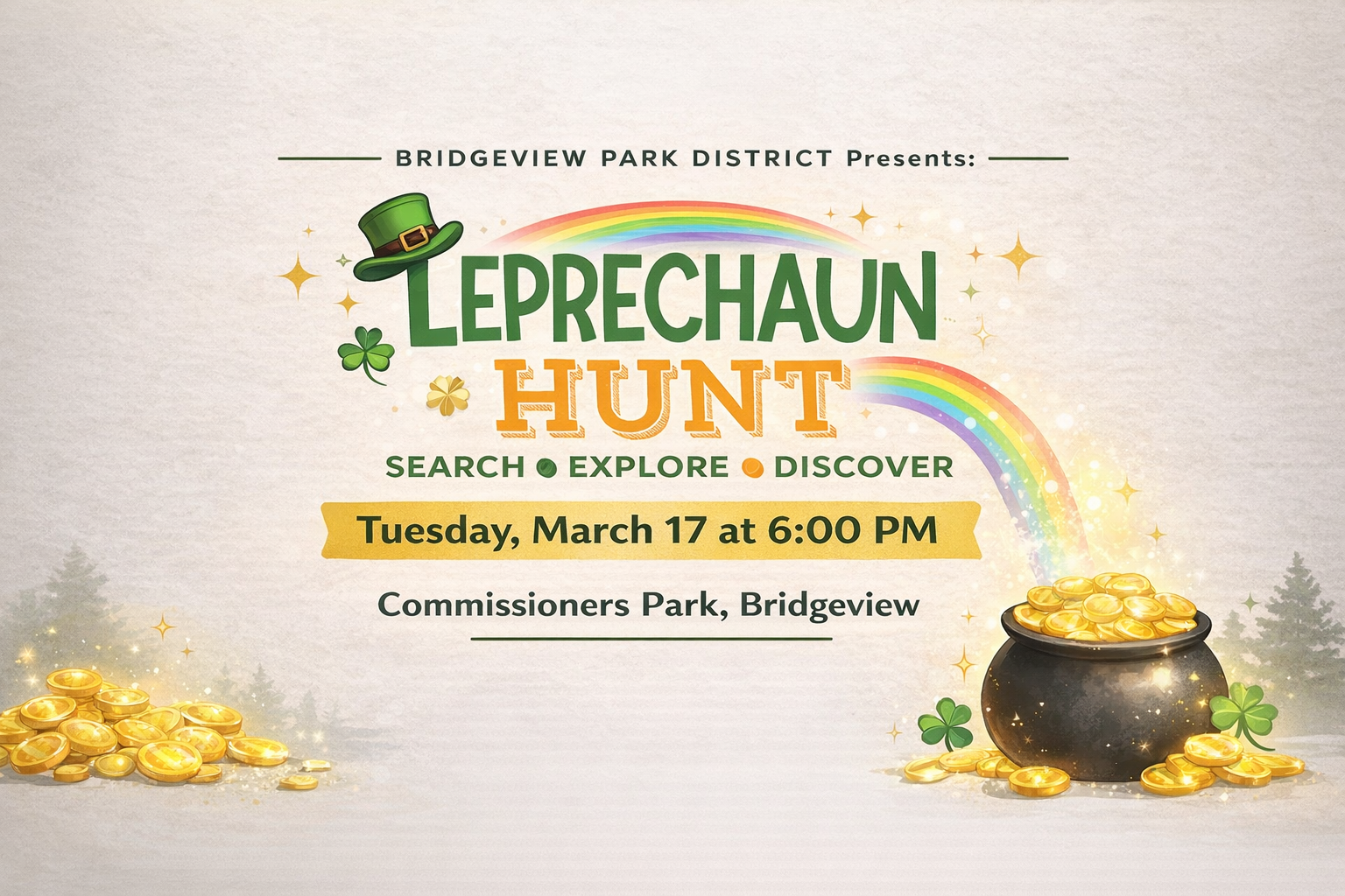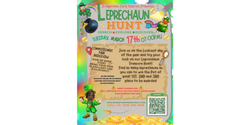 Bridgeview Park District invites you to celebrate the luckiest day of the year with our Leprechaun Hunt! πβ¨ Bring the family and get ready to search, explore, and discover as you hunt for hidden leprechauns and race to win the Pot of Gold! ππ―