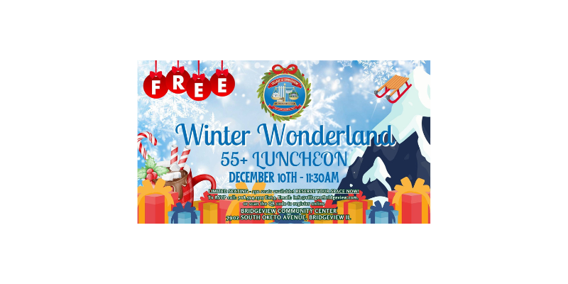 Mayor Landek and your elected officials cordially invite all Bridgeview residents 55+ to attend the Winter Wonderland Luncheon at the Bridgeview Community Center at 11:30 AM on Wednesday, December 10th. Enjoy a free lunch, delicious food, engaging entertainment, and the company of your friendly Bridgeview community. Get ready for prizes, dancing, and timeless holiday spirit!