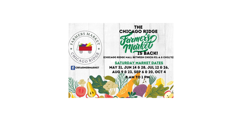 The Chicago Ridge Farmer’s Market is Back! With a brand-new prime location at Chicago Ridge Mall right on Ridgeland Avenue between Chick-fil-A and Chilis. Upcoming Farmer’s Market dates are Jul. 26th, Aug. 9th & 23rd, Sep. 6th & 20th, and Oct. 4th at 8 am – 1 pm.