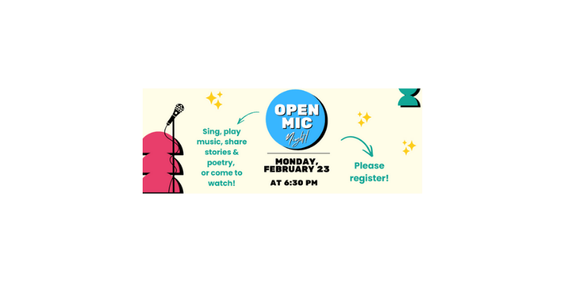 Join us for our Winter Open Mic on Monday, February 23 at 6:30 PM! Come share your creativity or sit back and enjoy an evening of local talent. Whether you’d like to read something you’ve written, play an instrument, sing, or simply be entertained, all are welcome.