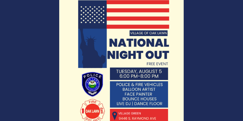 Come support your local Oak Lawn Police Officers & Fire Department! There will be Police & Fire vehicles, balloon artist, face painter, bounce houses, live DJ | Dance floor. This free event is on Tuesday, August 5th, from 6 pm – 8 pm.