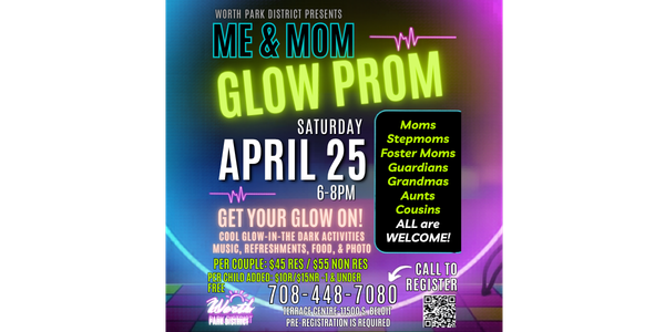 Get your glow on at the Me & Mom Glow Prom ✨ Enjoy a fun-filled evening with glow-in-the-dark activities, music, refreshments, food, and a photo booth.