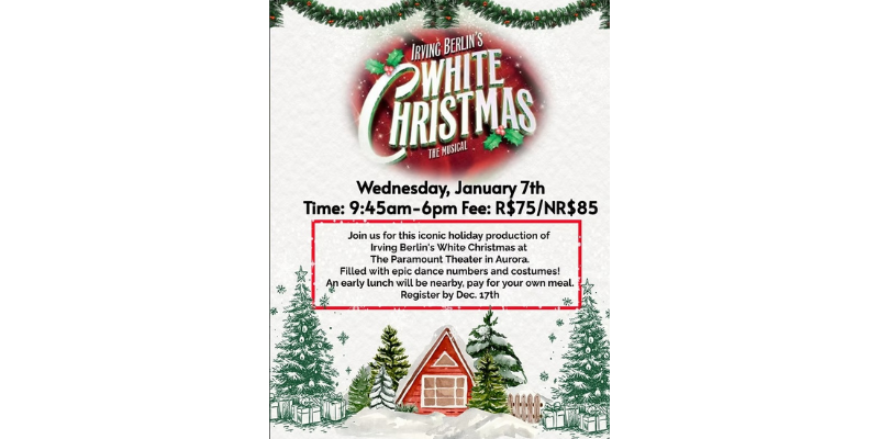 Join us for this iconic holiday production of Irving Berlin’s White Christmas at the Paramount Theatre in Aurora. Enjoy spectacular dance numbers, dazzling costumes, and classic songs that bring the season to life.